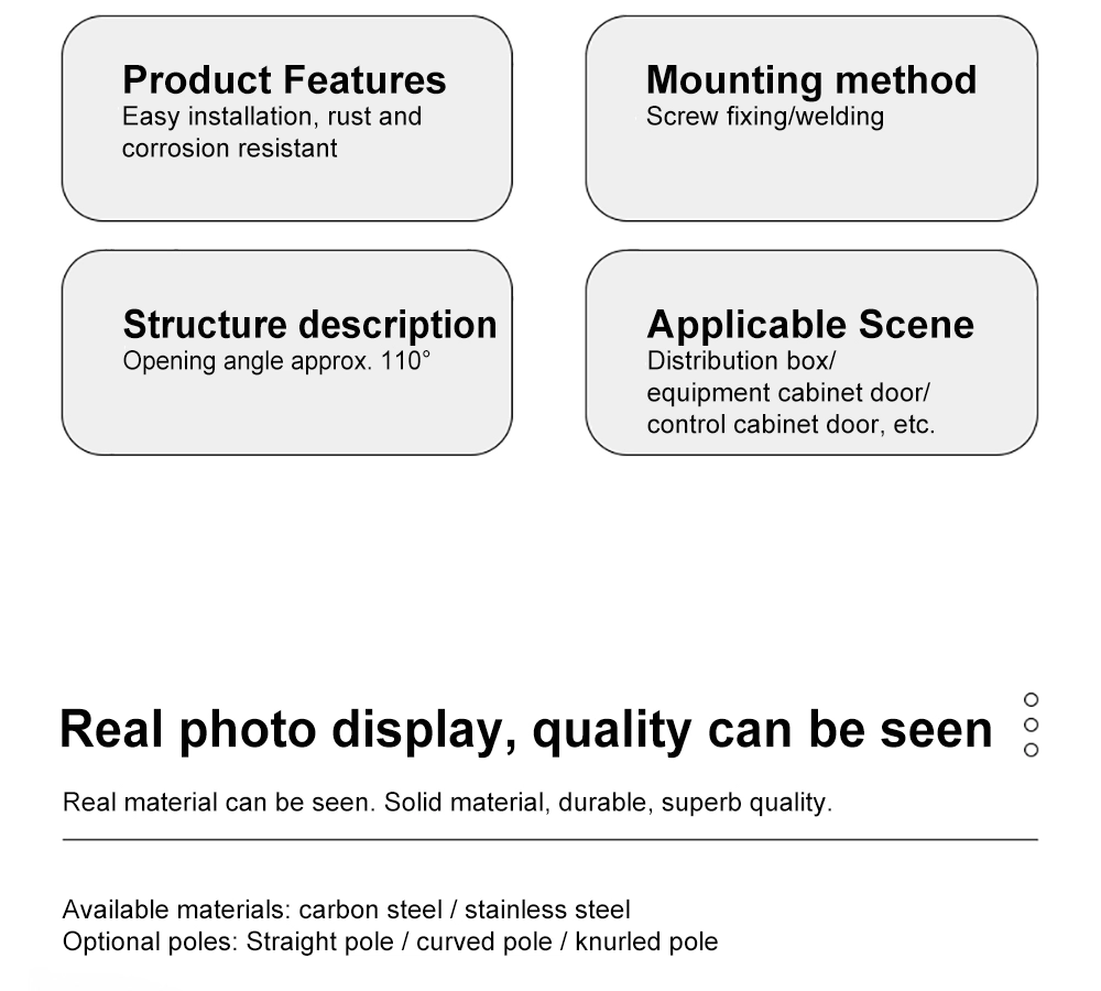 Yitai Lock қоймасында өнеркәсіптік шкаф жобаларына арналған тарату тақтасының айналмалы топсасы бар. 110°-қа дейінгі ашылу бұрышымен CL248 тарату тақтасының айналмалы топсасы сымдарды тарту, тексеру және техникалық қызмет көрсету үшін кең орын береді. Шкаф құрылымына негізделген бұрандалар немесе дәнекерлеу арқылы бекітуге болады. Қосымша түзу өзек, иілген өзек немесе иірілген өзек арқылы тарату тақтасының айналмалы топсасы есік жақтауының әртүрлі орналасуларына және құрастыру әдістеріне бейімделеді.