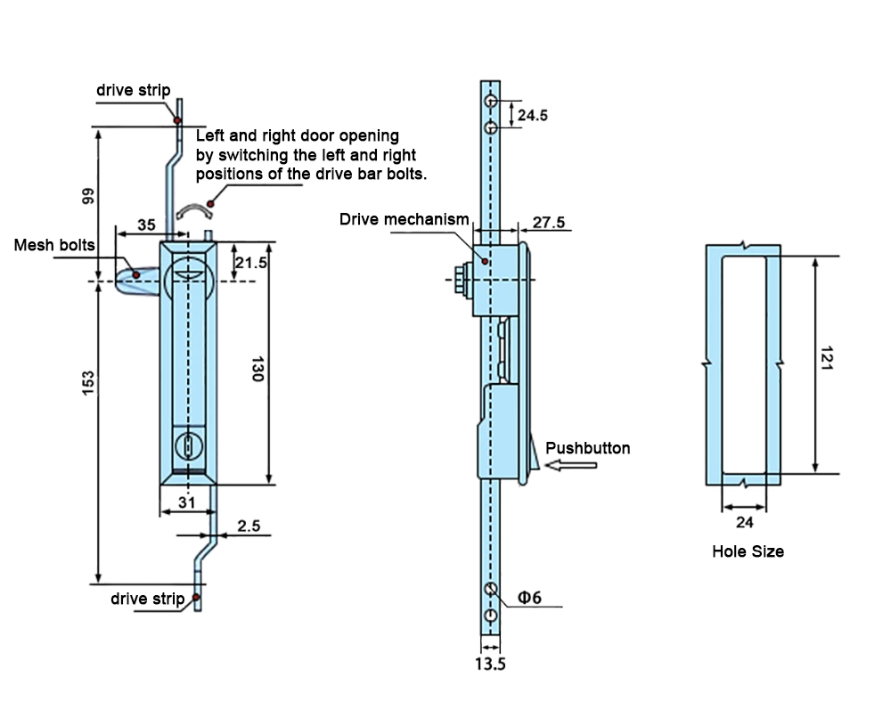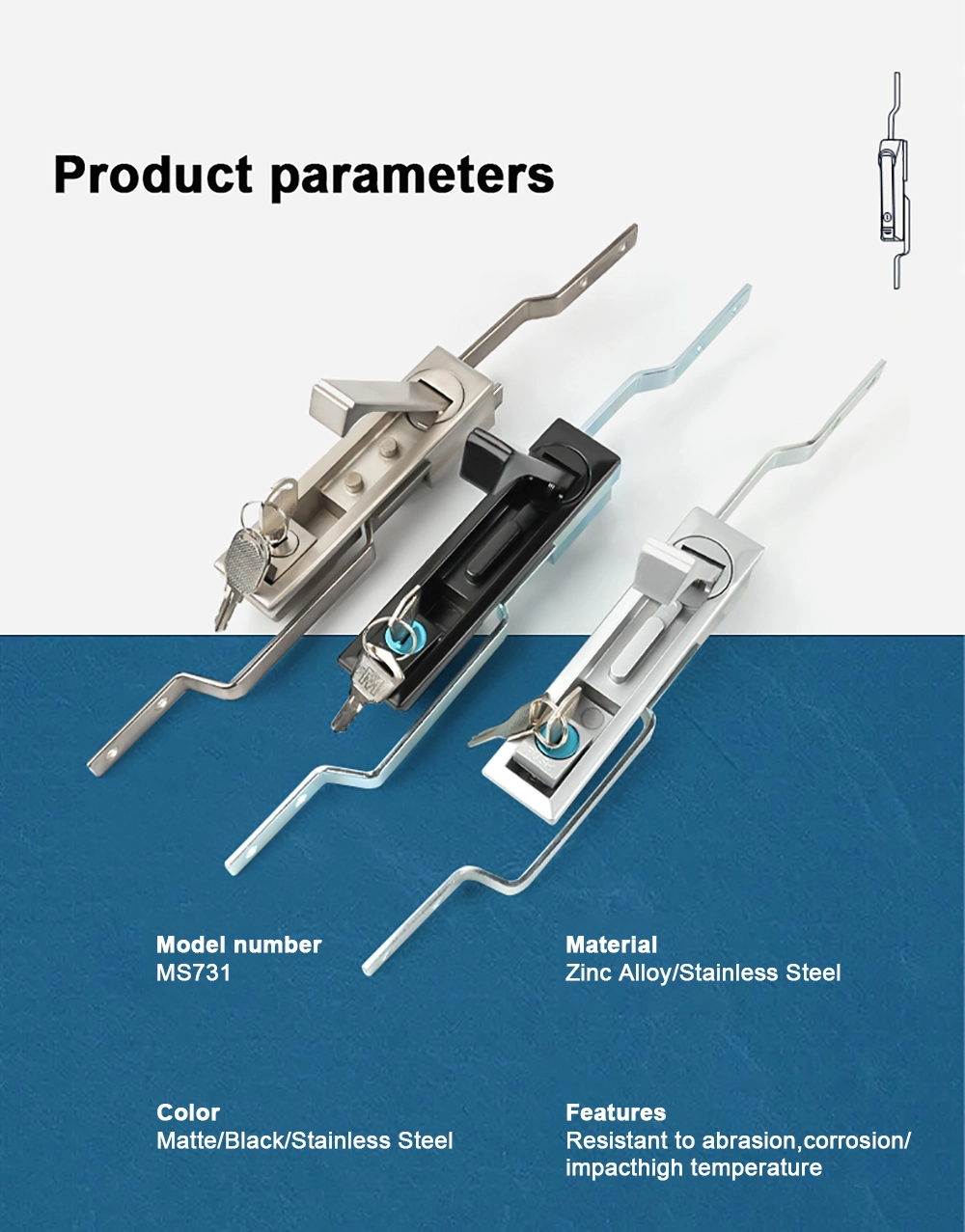 Тот баспайтын болаттан есіктің құлпы тот баспайтын болаттан жасалған, тот баспайтын болаттан жасалған, беріктік пен коррозияға төзімділік. Ашу өлшемі - 24 мм × 121 мм, стандартты орнату конфигурациясымен үйлесімділікті қамтамасыз етеді.
